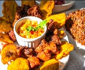 Fried pork bites served with fried plantains and Pikliz (spicy garnish)